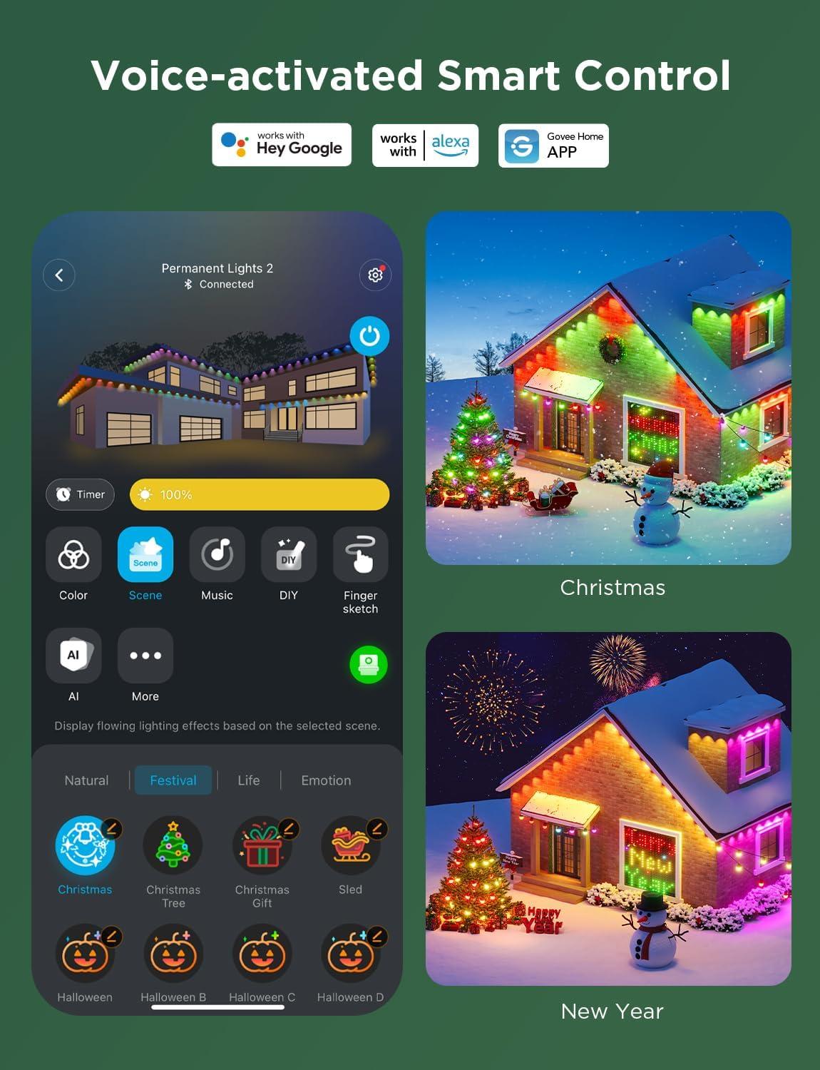 Smart Control: Manage your lights with voice commands via Alexa, Google Assistant, and Govee Home App. Adjust brightness, set timers, choose animation effects and enjoy group control. One-tap for Halloween decor and Christmas decorations.