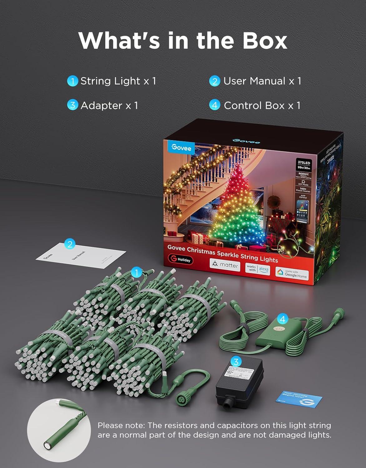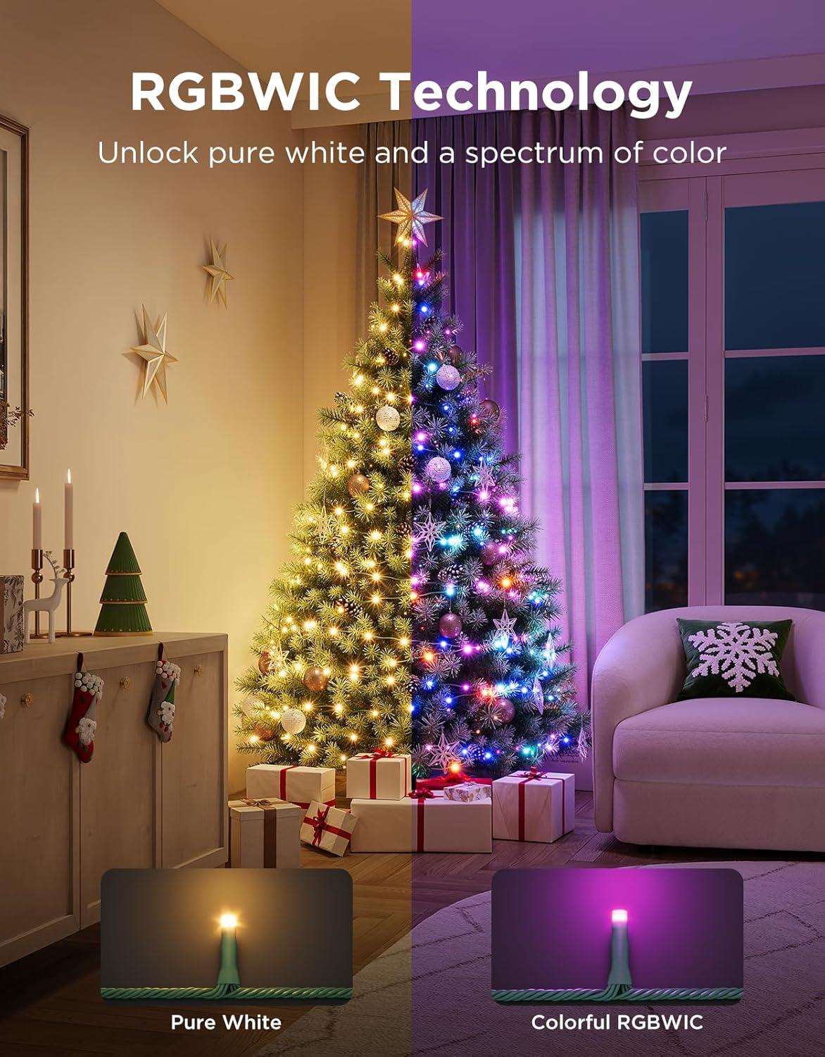 Rich RGBWIC Color Options: Govee Christmas Sparkle String Lights utilize UNI-IC tech for individual LED control, letting you choose from 16 million colors and smooth flowing lighting effects. Adjust the white temperature to match your holiday mood